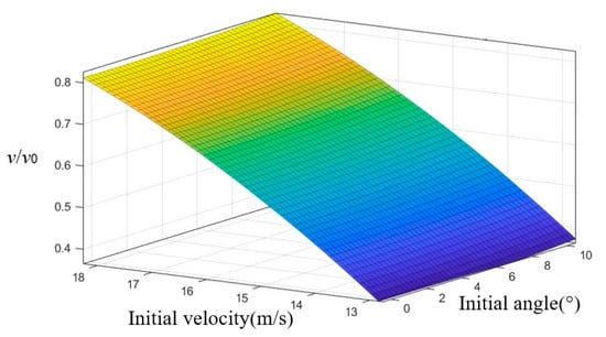 Equation (12) shows the fitting function relationship of the submersible aerial vehicle velocity v at the end of the water-exit process with respect to the different initial inclination angle x1 and water-exit velocity x2 and the reference velocity is v0 = 15 m/s, as shown in Figure 23.