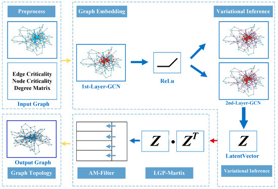 Main structure of the VGAE-AMF algorithm model. (Note that is the graph embedding vector of the input network and is the transpose of ).