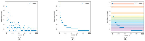 Distribution of the maximum node load when : (a) unsorted; (b) sorted; (c) schematic diagram of the interval grading algorithm.