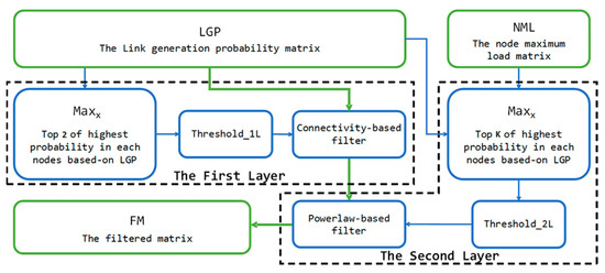 As shown in Figure 4, the adaptive multilayer filter is divided into two stages, i.e., two layers of filtering. To ensure network connectivity, the first layer is designed as a constant-value filter, and the minimum value of the two links with the highest probability of link generation among all nodes is used as the threshold of the first layer to perform the layer of connectivity-based filtering on the matrix. To control the degree of each node, the hierarchy of nodes is classified according to the interval grading algorithm in the above definition, and the threshold of the second layer is defined adaptively based on the different grades of the network nodes. Power-law distribution-based filtering is then performed to maintain the network in compliance with the scale-free property.