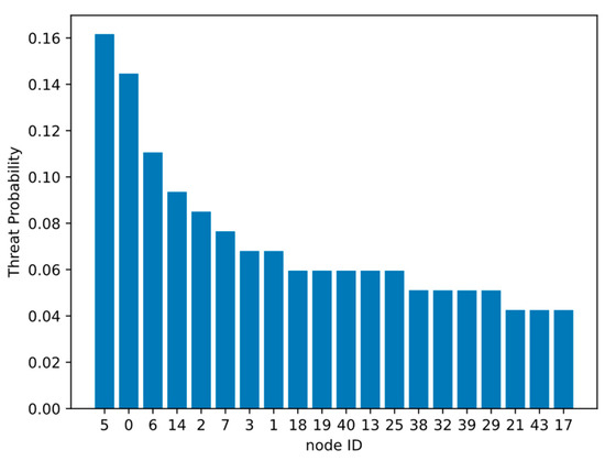 The high threat-degree node sequence calculated by the above definition is shown in Figure 5. In the simulation experiments, for random attacks, we adopted random node removal to simulate the impact of random attacks on the network. In the removal strategy, one node is randomly removed from the network each time, and a total of 20 nodes will be removed. The maximum connected subgraph size of the network will be recorded. For deliberate attacks, we removed high threat-degree nodes to simulate the impact of deliberate attacks on the network. In the removal strategy, the node with the highest threat probability is removed each time, and a total of 20 nodes will be removed. The maximum connected subgraph size of the network will be recorded.