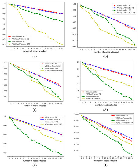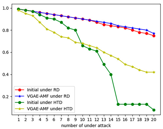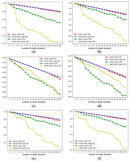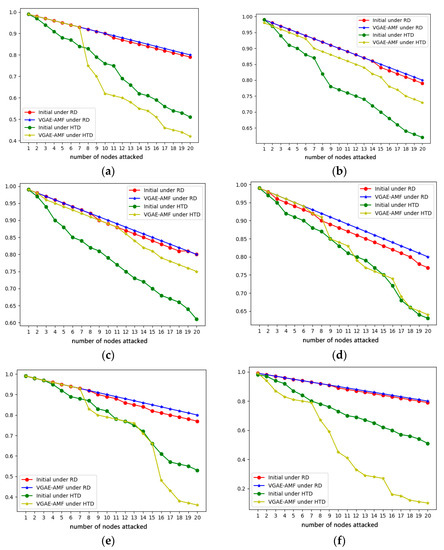 From Figure 7, Figure 8, Figure 9 and Figure 10, we can find that the network optimized by the VGAE-AMF algorithm performs better than the initial network under HTD attacks if we set the values of , and appropriately, and their performances under RTD attacks are similar, which has achieved our expected goal.