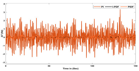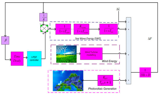 A simple proportional integral derivative (PID) and PI controller was used in the LFC design due to its simplicity [17,18]. For instance, to enhance the frequency response under various load disturbances, Ref. [19] proposed a PI-LFC-based particle swarm optimization (PSO) technique. In the presence of WT and PV, Alayi et al. [20] employed a PID controller as a secondary regulator to stabilize the microgrid’s frequency in island mode. A microgrid system that employed battery and pump-hydro storage systems was examined by the authors in [21] in order to analyze the frequency and power balance. Additionally, various optimization algorithms—including the fitness dependent optimizer (FDO) [22], ant colony optimization (ACO) [23], volleyball premier league algorithm (VPLA) [24], Fox optimizer algorithm (FOA) [25], salp swarm algorithm (SSA) [26], whale optimization algorithm (WOA) [27], improved fitness dependent optimizer (IFDO) [28], social-spider optimizer (SSO) [29], Jaya intelligent algorithm [30], Jellyfish Search Optimizer (JSO) [31], Antlion optimization (ALO) [32], PSO algorithm [33], and hybridization of sine cosine algorithm (SCA) with FDO [34] techniques—have been used to tune controller parameters. Additionally, some authors have introduced fractional-order PID controllers to address the LFC issue in multi-region units. As part of the PIDF controller, a low-pass filter can be added to the derivative coefficient of the PID controller to further enhance the dynamics of the system. As a result of the filter, it is possible to reduce the amount of undesirable high-frequency noise present in the control signal [35,36]. Furthermore, some researchers have also recommended using fractional and tilt order controllers in addition to traditional controllers in order to improve the performance of systems [37,38].