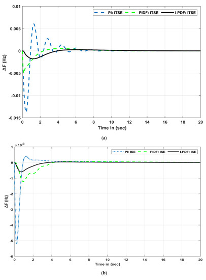 Due to their simplicity and ease of implementation, PID controllers are broadly used in engineering applications. Although PID controllers perform satisfactorily in most control systems, updated PID control structures have demonstrated improved performance in a variety of control systems, including the LFC interlinked power network. In order to improve the system dynamics, the PIDF combines a PID controller with a low-pass filter applied to the derivative term. By using a low-pass filter, the oscillations caused by high-frequency oscillations can be suppressed in the system. To stabilize the frequency of the system, a PIDF controller and its modified form are developed and implemented in this work for marine microgrid systems. The proposed PIDF and I-PDF control structures are depicted in Figure 4 and Figure 5, respectively. Similarly, the TF for the proposed PIDF and I-PDF can be found in Equations (26) and (27).