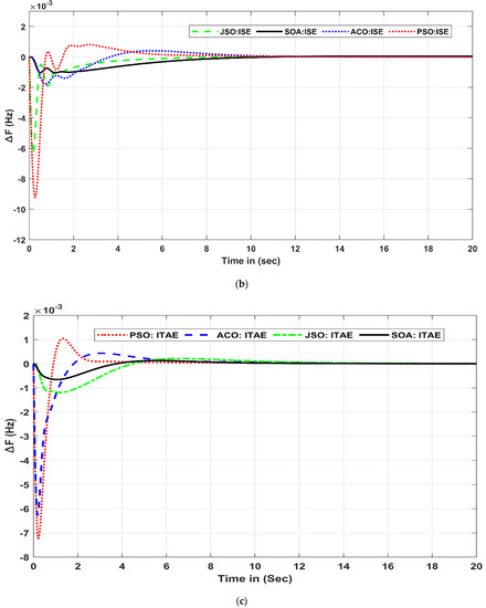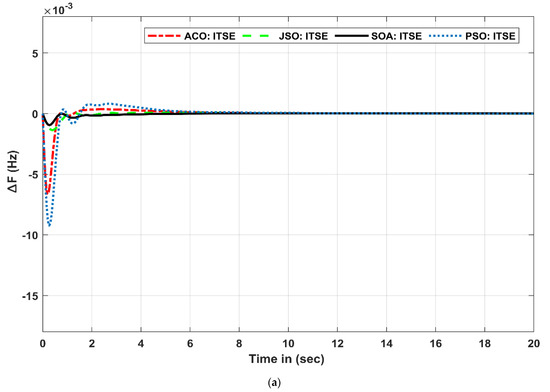 - The coefficient of the proposed I-PDF controller was optimized with a novel meta-heuristic algorithm known as the serval optimization algorithm (SOA). Other algorithms such as the jellyfish swarm algorithm (JSO), particle swarm optimization (PSO), and ant colony optimization (ACO) were used to verify the SOA’s effectiveness.