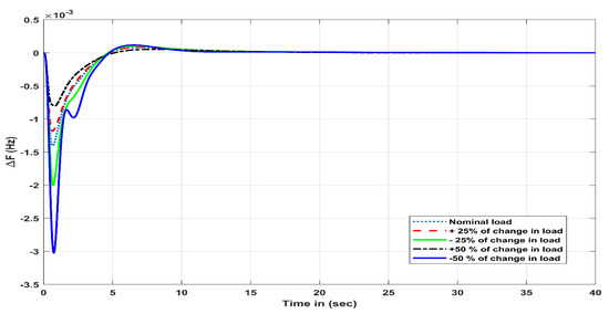 Under various loading disturbances, this scenario tested the resilience of the proposed SOA-based I-PDF controller. Figure 8 shows the frequency oscillations that took place when the load was changed, along with the different controllers utilized for it. From Figure 8, it can be noticed that the SOA-based I-PDF controller provided the best response to random load variations compared to the SOA-based PIDF and PI controllers. Compared to other controllers, our proposed controller achieved less steady-state errors, faster responses, and superior damped variation on a continuous basis. Furthermore, different load interruptions fluctuating from ±25% to ±50% were applied to a marine microgrid system in order to check the robustness of the proposed control scheme that was developed, and the results are shown in Figure 9 for comparison. The results clearly demonstrated that the proposed controller was able to produce the same fault-tolerance performance even when the load was varied from ±25% to ±50%. This clearly shows the robustness of our proposed controller. A sensitivity assessment was conducted by varying KPV, R, and Kwave by ±30% in order to test the robustness of the proposed SOA-based I-PDF controller. The dynamic responses of the model are illustrated in Figure 10 for the purpose of the above sensitivity assessment. Under uncertain conditions, the system dynamics will not deviate significantly from their base conditions, as shown in Figure 10. In Table 4, the transient response of various parameters is shown up to a ±30% change in parametric values. Finally, it was found that the parameters of the tuned I-PDF controller were quite robust to uncertainty as well as parametric variations of the proposed marine microgrid.