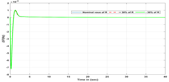 - To demonstrate the robustness of the proposed frequency control technique, sensitivity testing of the SOA-adjusted I-PDF controller was conducted under uncertain parametric variables such as the droop factor (R), Photovoltaic gain (KPV), and loading conditions.