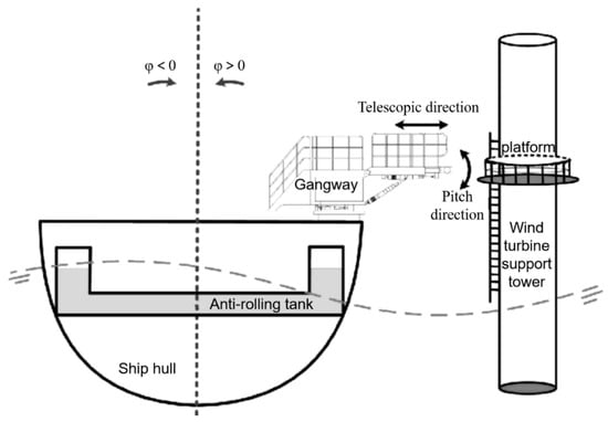 Zhang et al. improved the external structure of the anti-rolling tank by improving its inherent parameters [14]. Wen et al. used the MPS method based on semi-implicit moving particles to simulate the sloshing of an anti-rolling tank, and verified the applicability and reliability of the MPS method [15]. Hu used the speed and passive tank for comprehensive anti-rolling, and finally showed that the anti-rolling effect was obvious under this control mode [16]. Luo et al. used OpenFOAM to calculate the influence of grid size, tank damping plate, and high tank liquid level on the natural period and damping parameters of a U-shaped anti-rolling tank [17]. Rahul et al. used an optimization scheme based on a genetic algorithm combined with the inherent parameter-solver of the fluid in the anti-rolling tank to optimize the main dimensions of its design [18]. Liang et al. designed a passive U-shaped anti-rolling tank with adjustable period, which showed that the tank period can be matched with the rolling period of a semi-submersible ship by controlling the baffle, so as to achieve the best anti-rolling effect of the tank [19]. Immink took the active anti-rolling tank and the gangway on the ship as the main research objects and found that the motion of the gangway on the ship was not affected by the active anti-rolling tank [20]. In view of the limitation of the lack of systematic research in the past, a combination of modelling analysis, simulation, and hardware-in-the-loop experiment is adopted to study the impact of a controllable passive anti-rolling tank on the accessibility of the offshore wind O&M gangway. Figure 1 shows the schematic diagram of an offshore wind power operation and maintenance ship equipped with an anti-rolling tank approaching the wind turbine support tower through the gangway. As shown in Figure 1, the ship may experience unexpected roll motion due to the interference of waves. Due to the limitation of the anti-rolling capability, the anti-rolling tank can only reduce a portion of the ship’s roll motion. By adjusting the length of the telescopic and pitch rods installed on the gangway the remaining roll motion can be compensated as much as possible to ensure that the expected position of the end-effector remains unchanged. In this paper, the main research objective was to take the offshore wind power operation and maintenance ship, U-shaped anti-rolling tank, and gangway as the control objects, analyze and build a theoretical model of the system, and study the impact of the anti-rolling tank on gangway accessibility through simulation and semi-physical testing.
