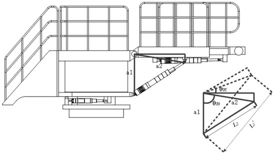 As shown in Figure 4, the length of the pitch rod is indicated by a solid line when the gangway is not compensated for the ship motion, and the length of the pitch rod is indicated by a dotted line when the ship motion is compensated. The initial included angle between the gangway pitch rod and the vertical line of the pitch axis is θ20. a1 is the vertical distance from the pitch axis center to the static hinge point of the pitch rod, and a2 is the distance from the pitch axis coordinate point to the dynamic hinge point of the pitch driver. According to geometric relationship, θ20 can be expressed as: