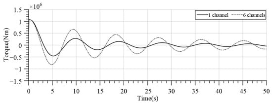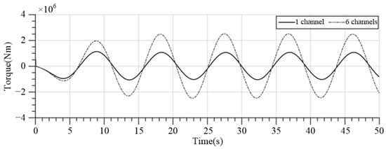 The forced oscillation simulation with 1 channel and 6 channels were carried out, and the forced oscillation curves are shown in Figure 8. The motion of the ship and the fluid in the anti-rolling tank are somewhat similar to sinusoidal and cosine motions. From the previous free decay simulation results, it can be seen that the damping of the anti-rolling tank decreases with the increase of the air valve opening. When the amplitude of ship roll motion is constant, the reduction of tank damping causes the liquid level in the side tanks to reach a higher position. Due to the fact that the anti-rolling tank provides anti-rolling force by the weight of the fluid in the side tank, the increase in liquid level in the side tank also increases the stabilizing torque that the tank can provide, to a certain extent. Consistent conclusions can be reached regarding the simulation results of forced oscillation and free decay, which mutually confirm the effectiveness of the CFD simulation and enhance the credibility of the results.
