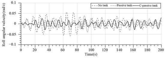 Roll angular velocity of no tank, passive anti-rolling tank, and controllable passive anti-rolling tank.