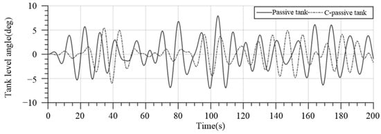 The maximum roll response of the ship under random wave excitation is shown in Table 4. It can be seen from Figure 11, Figure 12 and Figure 13 and Table 4 that under the same wave interference, the ship without an anti-rolling tank has the maximum roll amplitude. The controllable passive anti-rolling tank can constrain the flow of fluid inside the tank through air valves, making its anti-rolling effect superior to the passive anti-rolling tank. The tank liquid level does not exceed the limit of the maximum tank fluid angle in the event that the ship is equipped with a passive anti-rolling tank and a controllable passive anti-rolling tank.
