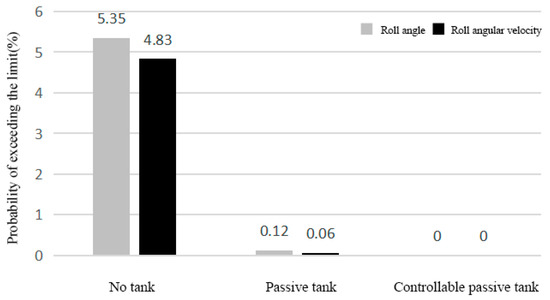 When the gangway is overlapped with wind power piles under the condition of a significant wave height of 2.5 m, the probability that the roll angle and roll angular velocity of the ship exceed the movement range of the gangway on the ship when the ship is equipped with no tank, a passive anti-rolling tank, or a controllable passive anti-rolling tank is calculated as shown in Figure 14.