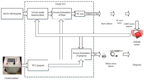 The control architecture of the hardware-in-the-loop simulation system is shown in Figure 16. The dashed box shows the real-time kernel running in the controller. The controller is connected to the servo driver of the 6-DOF motion platform through the Ether CAT bus, and connected to the gangway micro servo driver through the peripheral I/O module. The touch screen is selected as the development or expansion of the human–machine interface. The controller adopts Beckhoff’s industrial PC, and Beckhoff’s Twincat3 software supports the integration of MATLAB/Simulink; therefore, the Simulink model can be directly encapsulated and transplanted to the Twincat3 software platform for execution without intermediate secondary development. The real-time model of the ship with anti-rolling tank is built by the computer, and then integrated into the Twincat3 software platform. It forms a closed-loop system with the 6-DOF motion platform, attitude sensor, and gangway on the ship. In this way, the response time of the simulation program is consistent with the actual time, forming a real-time control system.