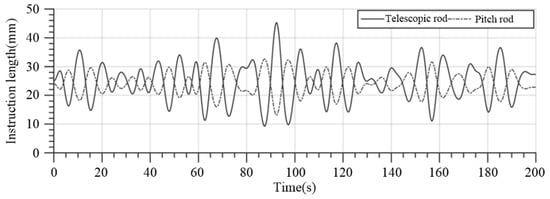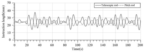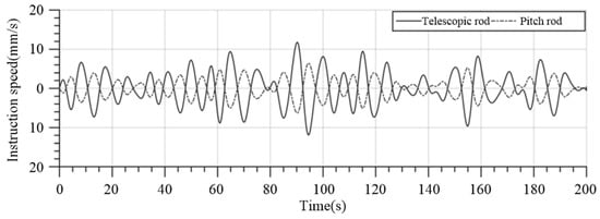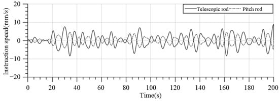 When the gangway end-effector is in the desired position, ΔL1 and ΔL2 are 25 mm and 24 mm, respectively. The HIL simulation results of the command length and speed of gangway telescopic rod and pitch rod under the condition of a significant wave height of 2.5 m and ship speed of 0 kn are shown in Figure 17, Figure 18, Figure 19 and Figure 20.