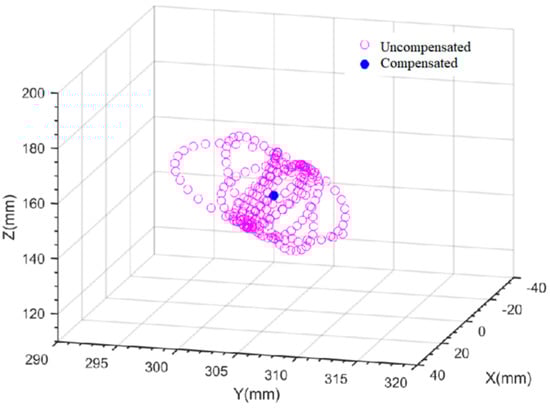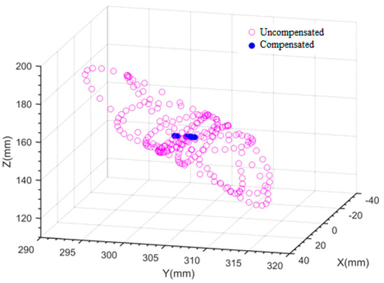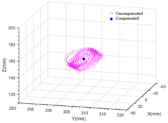 Based on the gangway kinematic model established in Section 2, the end-effector trajectories with and without compensated ship motion over the gangway are simulated under random waves with a significant wave height of 2.5 m. The simulation results are shown in Figure 21, Figure 22 and Figure 23. The hollow points in Figure 21, Figure 22 and Figure 23 show the position trajectories of the gangway end-effector when the gangway compensation function is not enabled and only under the action of the passive anti-rolling tank and controllable passive anti-rolling tank, respectively. The solid points in Figure 21, Figure 22 and Figure 23 show the position trajectories of the gangway end-effector under the combined action of the passive anti roll tank, controllable passive anti roll tank, and gangway compensation, respectively.