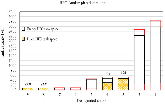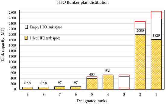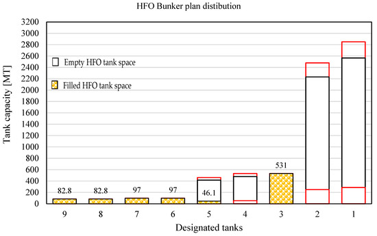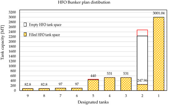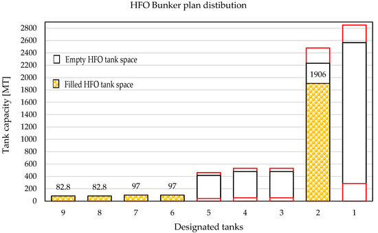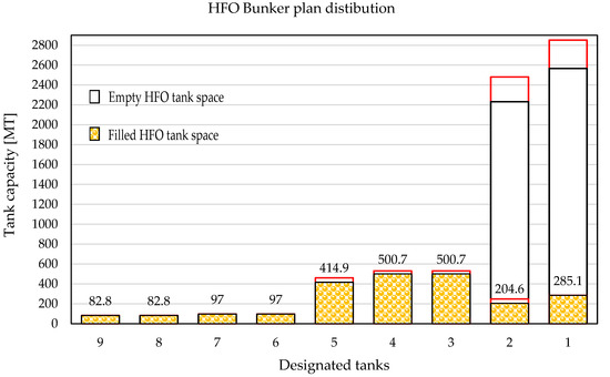 Several factors must be considered in order to plan the optimal quantity of HFO fuel inside tanks. As mentioned previously, forward bunker tanks are not allowed to be filled up to more than 85%, while aft tanks may be filled up to 90% by SMS policy. Therefore, those allowed quantities will be considered as 100%. Furthermore, loading of the new fuel is allowed if 10% of the tank is filled by the old HFO fuel (in which case, 90% of the new HFO fuel is allowed) or if 90% of the tank is filled by the old HFO fuel (in which case, 10% of the new HFO fuel is allowed) to fulfil the rule concerning commingling. In order for the vessel to maintain stable plant operation, HFO service tanks (enumerated as No8 and No9 in Table 2) should be filled up to 90% before the bunker operation, in order to avoid a blackout scenario during the bunkering of the ship. Therefore, they will be excluded from consideration. With such limitations, the number of disposable tanks is reduced from nine to seven HFO tanks. Thus, the number of possible combinations for distributing the fuel equals 27, or 128 possible combinations, which vary from empty to partially filled tanks before bunker operations.