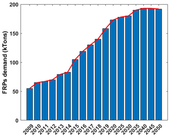 All these aspects have raised the demand for composite materials over the last 40 years in existing and emerging industries, and during these years, despite the COVID pandemic, the demand for CFRPs is growing at a current rate of 11% per year because of the increasing need for lightweight materials. It was estimated that CF demand was around 120 kTons during the present year [8,9,10]. Composite material demand is also rising over time due to new targets for a reduction of CO2 emissions and the need for structural components that conciliate both light weight and high strength. It is possible to observe from Figure 1 that the global demand for CFRP materials increased from almost 68 kTons in 2010 to around 170 kTons in 2020 [11,12,13]. A further increase is expected in the near future as it is estimated that the demand for CFRP composites will reach almost 190 kTons in 2050 [11,12,13].