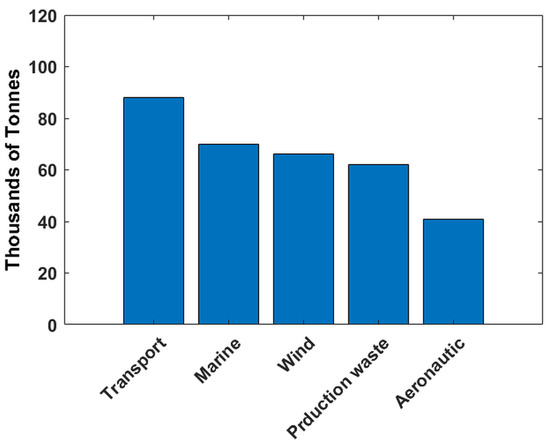 Based on a primary analysis of the diffusion of composite materials in the industrial world and the rising demand in terms of their use, it is possible to conclude that the amount of waste materials will inevitably increase. Therefore, based on the prevision of waste production per industrial sector by 2025 (Figure 2), there is a strong need to know and study appropriate recycling strategies for this category of materials [17].