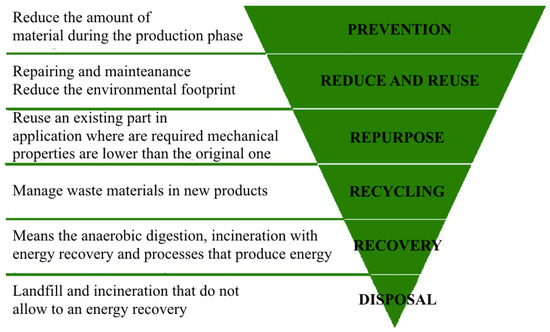 The above-mentioned 2008/98/EC directive on the recyclability of composite materials defines a waste material hierarchy (Figure 3), suggesting to the state members the appropriate recycling route in order to reduce landfill disposal and environmental issues [34]. The use of an appropriate recycling method reduces not only the environmental impacts but also the production of virgin raw materials and the overall cost of new recycled industrial products. For example, it is estimated that, even if some recycling methods are still expensive in terms of energy requirements, the production of recycled glass fibres (rGFs) and resin requires, respectively, almost 25–30 MJ/kg and 20–90 MJ/kg in comparison with 13–45 MJ/kg and 76–137 MJ/kg required to produce virgin materials. In addition, recycled materials do not require the same amount of fossil fuel consumption used to produce virgin ones. All these aspects make recycled materials more competitive, allowing the use of these materials in a closed loop in accordance with the circular economy philosophy [45,46,47,48].