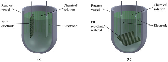 Figure 5. Schematisation of the electrochemical recycling process: FRP material used as electrode (a); FRP recycling material in electrochemical solution (b).