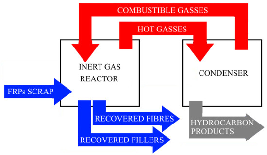 Pyrolysis is a destructive method where synthetic fibres are recovered through matrix decomposition into a mixture of solids, oils, gases and char substances. Polymeric matrix disintegration is performed in an inert atmosphere where the thermosetting composite material is heated to a high temperature in the range of 400–1000 °C, depending on the nature of the composite matrix [16,78,79,80]. A schematisation of a typical pyrolysis method is represented in Figure 7.