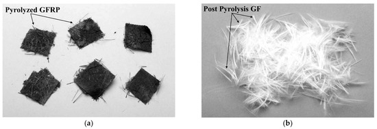 The absence of oxygen during matrix disintegration leads to the formation of some char materials on the fibre surface. Therefore, an additional post-pyrolysis procedure in a furnace is required to remove the residues of char materials with the aim of obtaining cleaner recycled fibres [19,81]. This recycling process is used for both GFRPs and CFRPs, with some differences below discussed.