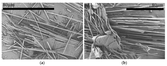 An example of recovered GFs is represented in Figure 8, where it is possible to distinguish rGFs before and after post-pyrolysis treatment [81]. During the process, the recycling composite material is placed into a reactor and subjected to a temperature of around 450 °C for a period of 270 min. The pyrolyzed fibres (Figure 8a) are characterised by a black aspect because of the deposition of materials that derive from the matrix carbonisation, preserving, at the same time, the typical aspect and structure of the composite material [81]. On the other hand, considering rGFs after the post-pyrolysis process (Figure 8b), it is possible to assert that the fibres do not present the tendency to agglomerate as well as in Figure 8a; therefore, it is possible to conclude that all char materials have been removed from the additional process [81].