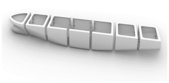 The Duisburg Test Case Hull, a Post-Panamax container ship [64], was selected as the case study. Based on the publicly available IGES (Initial Graphics Exchange Specification) geometry, a 1:135 scale model was constructed at “Dunarea de Jos” University and used for the experimental campaign. The model was made from PLA (Polylactic Acid) filament and 3D printed in several small sections (Figure 1) that were combined to create the final hull.