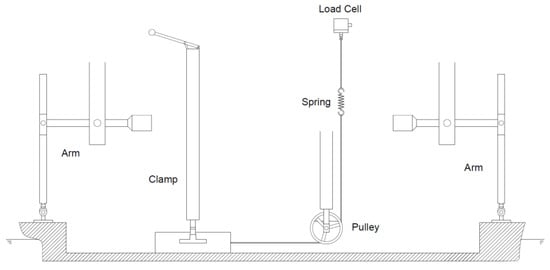The model was connected to the towing carriage by a lightweight wire, one spring, one force sensor, and a seakeeping guiding arm system. The spring stiffness was selected to avoid large initial surge motion amplitudes and surge resonance couplings. Specifically, the eigenfrequency of the arms–model–spring system in the surge direction was smaller than one-half of the lowest wave encounter frequency, as recommended by the International Towing Tank Conference (ITTC) [65]. The resistance was measured with a load cell (Z6 bending beam load cell) directly attached to the carriage through a calibrated pulley–spring–wire system. This setup also included a clamp that holds the model during the acceleration or deceleration phases of the carriage. The seakeeping guiding arm system allowed the model to pitch, heave, and surge (sway, yaw, and roll motions were restrained). Figure 2 presents a schematic of the setup described above.