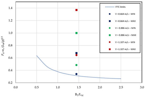 The test methodology followed for each run was kept during the entire campaign. Before each test, the zero reading of all measuring equipment was established over a long enough time. The zero reading was also checked between the runs to avoid zero-drifting-related problems. Since the model was 3D printed, it was continually checked for water intake. The location of the wave probes was decided to obtain fully formed waves and reduce as much as possible the influence of the model and reflected waves on the measurements. Precisely, two wave probes were attached to the carriage (approximately at the aft and forward perpendiculars), and one was located at roughly (3 L of maximum wavelength) m in front of the wavemaker. The wavemaker flap motion was also recorded. As required by ITTC [66], the measured variation in the regular wave height was lower than 5% between the different wave probe positions. The water level was also frequently fixed at the above-mentioned water depth. The model’s motions were logged with three AcuRange 500 Laser Position Sensors (AR500). The AR500 is a laser-based triangulation sensor that records distances by projecting a beam of light onto the target to be measured. The distance was computed from the image pixel data using a microprocessor. Two vertical lasers are able to record the vertical movements, and one longitudinal laser logs the surge motions. The combination of the three gives the pitch rotation motions. All the waves were calibrated without the presence of the model. Possible interference effects caused by the waves reflected by the towing tank side walls were determined by following the method recommended by ITTC for head waves [65]. The maximum value of ( is the Froude number, is encounter wave frequency, is the model length, and g is the gravitational accelerations) at which side-wall interference occurs in head waves (0.314) was always lower than the actual values (0.339–1.307). Figure 3 shows the maximum and minimum for each ship speed compared to the recommended ITTC limits for side-wall interference.