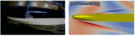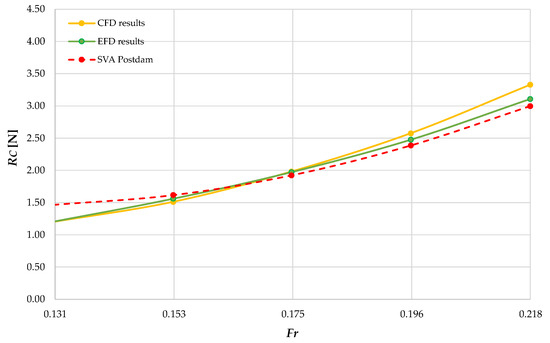 The two resistance curves, displayed in Figure 4 (where the EFD results are from the experimental test performed at ETSIN-UPM and the SVA Postdam are the results from the benchmark), show a satisfactory comparison. Numerical simulations were also performed, and the results were added to Figure 3. The CFD resistance curve shows a good comparison with the UPM experimental data. It is also important to note that during the calm water tests, no non-stationary effects were observed based on the qualitative analysis of Figure 5.