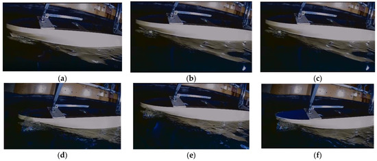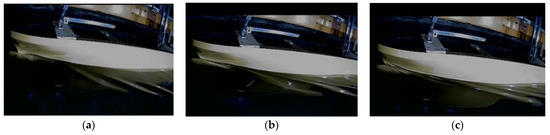 Another phenomenon that can affect the added resistance is the nonlinear behaviour of the bow wave [52]. Choi and Huijsmans [73] and Huijsmans and Wellens [74] investigated the nonlinearity of added resistance induced by bow wave breaking. To study this aspect, they made visual observations during the experimental test in regular head waves, and three categories were identified: plunging breakers, spilling breakers, and non-breaking conditions. Plunging is defined as an overturning detachment of the bow wave crest, and spilling is a type of turbulent form that disturbs the adjacent flow field [73]. Therefore, a similar qualitative analysis of the bow wave recorded during the tests was conducted to determine whether the double peak found on the added resistance coefficient curve could be related to the change in type or the strength of bow wave breaking. After a systematic analysis of all recordings made during the experiments, it can be concluded that no significant change of the bow wave can prove the drop of the added resistance in waves at λw/LPP equal to 1.0, as shown in Figure 10. For the highest wave height at λw/LPP equal to 1.125, one can notice a supplementary immersion of the bow in comparison with the other two wavelength cases (Figure 9) and slightly green water that can justify the increase in the added resistance in waves higher than the first peak at λw/LPP equal with 0.825 (Figure 8).