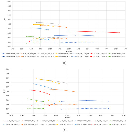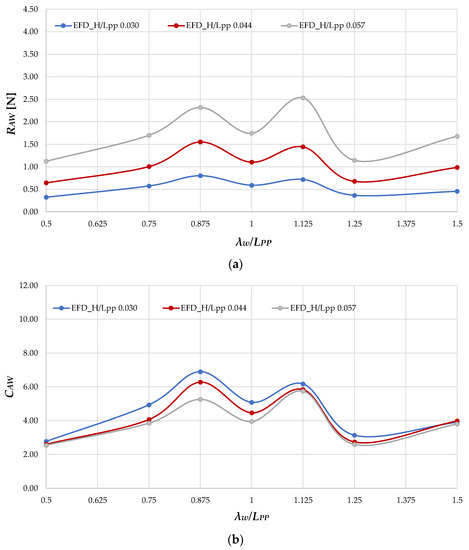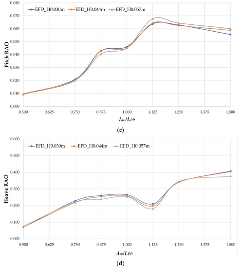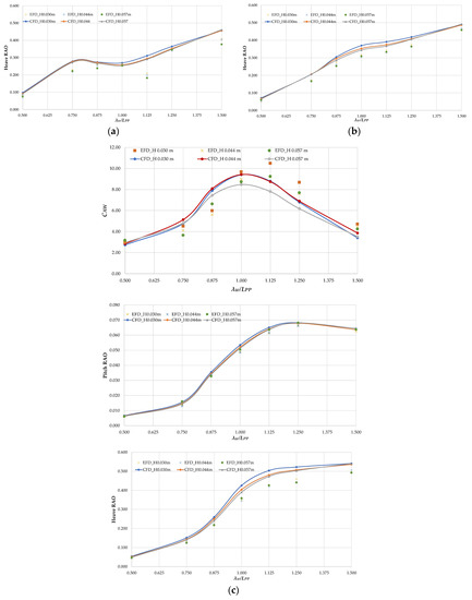 where RTw is the total resistance in waves, RC is the total resistance in calm water, ρ is the density of the water, g is the gravitational acceleration, Hw is the wave height, BWL is the waterline beam of the model, and LPP is the length between perpendiculars. The response amplitude operators for heave and pitch were calculated to examine the ship’s behaviour in regular waves.