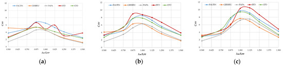 Comparisons of the results for added resistance coefficient: (a) 0.131; (b) 0.174; (c) 0.218.