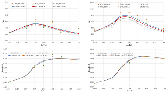 The added resistance coefficient, pitch RAO, and heave RAO were computed. The added resistance coefficient was calculated as follows: