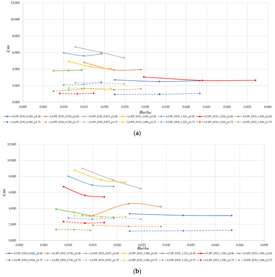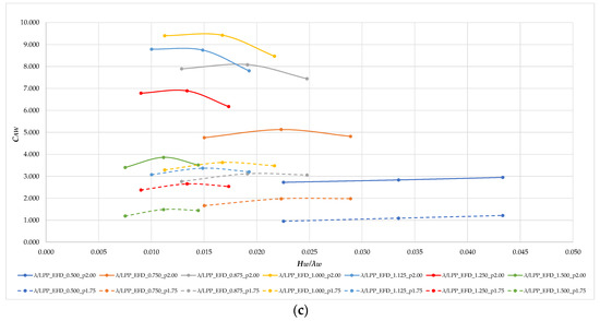 Usually, the added resistance curve has only one peak where the wavelength is approximately equal to the ship length. However, for the lowest ship speed, the curve shows two local maxima: one at λw/LPP = 0.875 and the other at 1.125. This trend is consistent for all the wave heights, as shown in Figure 6a. It is also possible to notice that the double resonance phenomena are more significant with the increase in wave steepness. On the contrary, only one peak value can be seen for the higher ship speeds, as shown in Figure 7. The pitch motions presented in Figure 6c show a good correlation between the pitch curve and non-dimensionalised added resistance in waves. Two local maxima corresponding to λw/LPP = 0.875 and λw/LPP = 1.125 also appear on the pitch curve. The heave RAO curves for the lowest speed drop significantly at λw/LPP = 1.125. However, no heave drop can be noticed for the wavelength of λw/LPP = 0.875. This may suggest that the unexpected increase in added resistance coefficient could be related to increased pitch motions. In addition, it is also possible to see that wave amplitude has a small influence on the heave and pitch RAOs. Another observation that can be made is related to wave steepness. Increasing the steepness does not affect the double resonance phenomena, and the only thing that changes is the migration of the absolute maximum from λw/LPP = 0.875 at lower steepness to the λw/LPP = 1.125 at highest steepness.