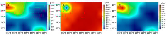 According to the CRUST 1.0 model, the 1° × 1° average crustal density model of the study area was constructed, as shown in Figure 2a. The seawater density model calculated based on Equation (9) using shipborne bathymetric data is shown in Figure 2b. The corresponding density contrast model is shown in Figure 2c.