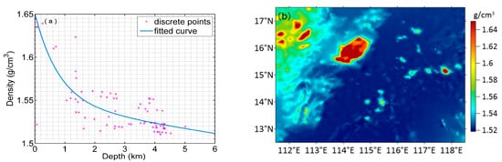 First, the ETOPO1 model was used to eliminate the abnormal values in the data of the shipborne sounding control points. Then, using the crustal model CRUST 1.0 and seawater density data, an empirical model of the variation of density contrast with depth in the study area was constructed according to Equation (2).