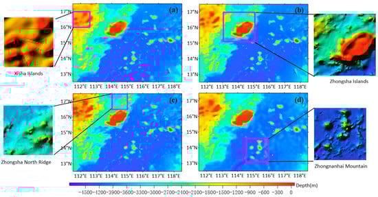 The model of the seafloor topography generated via (a) ST1, (b) ST, (c) ETOPO1, and (d) DTU10. The magenta boxes indicate the locations of the Xisha Islands, Zhongsha Islands, Zhongsha North Ridge, and Zhongnanhai Mountain.