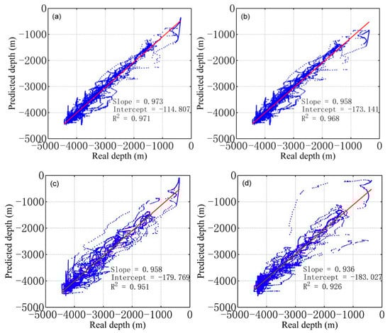 Regression fitting results of the predicted depth of four different models and the real depth of the SSD: (a) the result for ST1, (b) the result for ST2, (c) the result for ETOPO1, and (d) the result for DTU10. The red line indicates the fitted result. R2 is the fitted correlation coefficient.
