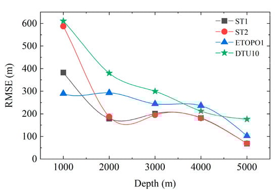 From Table 3 and Figure 9, there is an approximate trend of improving accuracy with increasing depth for all four models. In the depth range of 0~1000 m, the accuracy of all four models is not satisfactory. However, the ETOPO1 model has significantly better accuracy than the other three models, followed by the ST1, ST2, and DTU10 models. The ST1 has an accuracy of 178.22 m in the range of 1000 m to 2000 m, which is significantly superior to the other three models. At depths between 2000 m and 4000 m, the accuracy of the ST2 model is slightly better than that of the ST1 model. Notably, in the depth range above 4000 m, the accuracy of ST1 and ST2 are basically the same and obviously better than ETOPO1 and DTU10 models. Combined with Figure 3a, the rate of change of density contrast gradually decreases with increasing depth, so that ST1 and ST2 remain basically the same in the deep region. However, in the depth range from 0 to 2000 m, the rate of variability of the seawater density is larger, and the accuracy of the ST1 inverse by the VDTCCM is significantly better than that of the ST2. Therefore, it is necessary to consider the density variation of seawater in the middle and shallow areas. Meanwhile, the accuracy of the international models ETOPO1 and DTU10 is not satisfactory in shallow areas, and the RMSE of the two models reaches the minimum value in the depth range greater than 4000 m, which are 102.03 m and 175.67 m, respectively. Therefore, different inversion algorithms or depth substitutions using international models can be considered to improve the overall accuracy when inverting the seafloor topography over a large area.