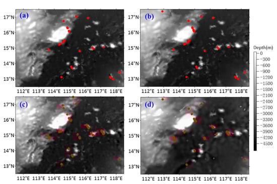 First, the pre-processed discrete SSD were gridded using the Kriging interpolation. Then, the seafloor topographic grid and gravity anomalies were filtered to obtain data in different wavelength ranges. Second, bilinear interpolation was used to obtain filtered gravity anomalies and SSD at the position of the control points, respectively. Subsequently, a linear regression was fitted based on the least-squares method. The fitted parameters were also used to invert the initial seafloor topography in the medium wavelength ranges with the filtered gravity anomalies. Finally, the initial model was corrected using Equation (4) and the final seafloor topography was constructed by adding the long wavelength topography component of the SIO 24.1 seafloor topography to the corrected topography based on Equation (5). The result is shown in Figure 3a. In addition, to avoid edge effects during the inversion process, the study area was treated with a 1° outward expansion around each of its perimeters. ST1 (seafloor topography one) (Figure 7a) is the result based on the VDTCCM method. ST2 (seafloor topography two) (Figure 7b) is a model modified via constant density contrast. Figure 7c,d show the international seafloor topography models ETOPO1 and DTU10, respectively. These two international models are comparisons for the results of the inverse seafloor topography model.