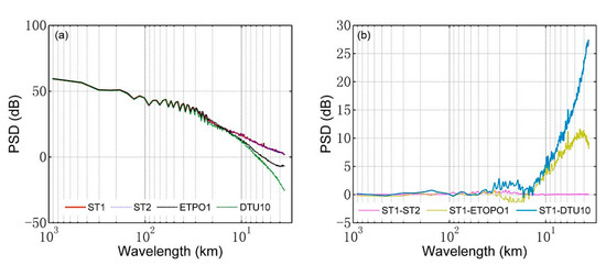 In addition, we analyzed the power spectral density (PSD) of the ST1, ST2, ETOPO1, and DTU10 models to determine the energy variation of the models at different wavelengths. From Figure 11, we can see that the PDS of the four models are basically the same at long wavelengths, while the differences at short wavelengths are more obvious. From Figure 11b, we can see that the ST1 has higher power at short wavelengths of less than about 15 km compared to the other three models. This indicates that the model modified with the VDTCCM method contains information related to the topographic nonlinearity in the gravity anomaly. Therefore, ST1 provides more significant advantages in the detailed description of topography. The curves of the PSD for ST1 and ST2 are nearly the same, with a difference of about 0.1 dB on average. Therefore, the two models have basically the same ability to express topographic features, which is mainly related to the use of the same gravity anomaly and control data in the inversion of the seafloor topography. Furthermore, the PDS of the ETOPO1 model is slightly higher than the other three models in the wavelength range of 15 km to 30 km, indicating the advantage of the ETOPO1 model for the representation of small- and medium-scale topographic features. We believe that this is related to the incorporation of shipboard sounding data in the construction of the ETOPO1 model.