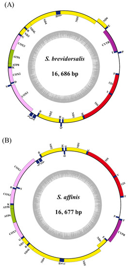 The complete mt genomes of S. brevidorsalis and S. affinis were sequenced and deposited in a database (accession numbers: OQ581844 and OQ581845, respectively). The lengths of the complete mt genomes of S. brevidorsalis and S. affinis were 16,686 bp and 16,677 bp, respectively. The complete mt genomes of S. brevidorsalis and S. affinis contained 13 protein-coding genes (PCGs), 22 transfer RNA genes (tRNAs), and 2 ribosomal RNA genes (rRNAs) (Table 1 and Table 2, Figure 1). The complete mt genome of S. brevidorsalis had the following base composition: A (24.9%), T (31.3%), C (16.4%), and G (27.4%). For S. affinis, the overall base composition was as follows: A (31.4%), C (27.3%), T (24.8%), and G (16.5%). Possible strain-specific differences may be related to the base composition of the complete mt genome. For example, the A + T and G + C contents of the 13 PCGs in the complete mt genome of S. brevidorsalis were 55.6% and 44.4%, respectively, while the contents in all sequences were 55.2% and 44.8%, respectively. In the case of S. affinis, the A + T and G + C contents of the 13 PCGs in the complete mt genome were 55.7% and 44.3%, respectively, while the contents in all sequences were 56.2% and 43.8%, respectively. In S. brevidorsalis, most PCGs (12 of 13 genes) initiated with the start codon ATG, while COX1 initiated with the start codon GTG. Eleven PCGs terminated with TAA/TAG, while ND4 and COX1 terminated with TAT and GAA. In the case of S. affinis, most PCGs (12 of 13 genes) started with ATG, whereas COX1 initiated with GTG. Ten PCGs terminated with TAA/TAG, while ND1, COX1, and ND4 terminated with AGT, AAG, and TAT, respectively. Therefore, we suggest that comparative analysis of the complete mt genomes of S. brevidorsalis and S. affinis revealed species-specific differences in the mt genomes of deep-sea eel species.