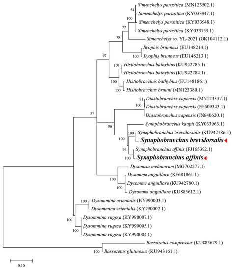 To determine the molecular phylogenetic tree of S. brevidorsalis and S. affinis, a total of 26 mtDNA COI sequences from the Synaphobranchidae eel family (genera: Simenchelys, llyophis, Histiobranchus, Dysomma, Dysommina, Diastobrachus, and Synaphobranchus) were obtained from the GenBank database and aligned with the sequences generated in this study. Bassozetus compressus and Bassozetus glutionsus (Ophidiidae eel family) were used as the outgroup. The nucleotide sequences of individual mt COI genes were aligned using the ClustalW algorithm of the MEGA software (ver. 10.0.1; Center for Evolutionary Medicine and Informatics, Tempe, AZ, USA). To establish the best-fit substitution model for phylogenetic analysis, the model with the lowest Bayesian Information Criterion (BIC) and Akaike Information Criterion (AIC) scores was estimated using a maximum likelihood (ML) analysis. According to the results of the model test, ML phylogenetic analyses were performed with the LG + G + I model using the MEGA software (ver. 10.0.1; Center for Evolutionary Medicine and Informatics). Rapid bootstrap analysis was conducted with 1000 replications with 48 threads running in parallel.
