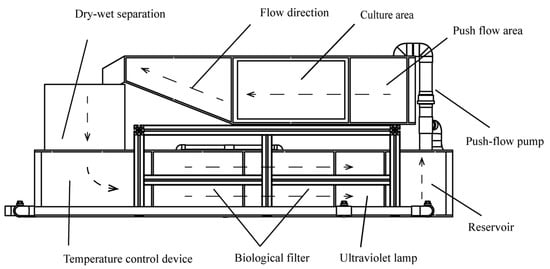 A batch of juvenile coral trout was obtained from Delin Chengxin Aquaculture Co., Ltd. (Lingshui, China) with an initial body weight of 92.01 ± 8.04 g and a body length of 15.40 ± 0.65 cm. The culture experiments were carried out in a recirculating water culture tank at the pilot plant of the Institute of Fisheries Machinery and Instruments of the Chinese Academy of Fisheries Sciences (Figure 1). The system consists of a culture tank, a push-flow water pump, a wet and dry separation filter, a moving bed, a UV sterilization device, and a reservoir. The mobile bed has an oxygenating and aeration device to ensure the presence of sufficient dissolved oxygen in the experimental setup. Each tank is equipped with a push-flow water pump, and the intended water flow velocity is provided by a pump (Pond Spring, ABB-200), pushing the water at a speed of 0.5–7.5 bl/s (10–120 cm/s) in the tank.