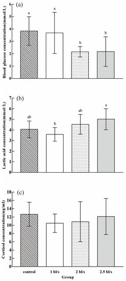 Effect of water flow velocity on blood biochemistry of fish (Plectropomus leopardus), (n = 6). (a) Blood glucose concentration; (b) lactic acid concentration; (c) cortisol concentration. Different letters indicate significant differences among groups (p < 0.05). No letter means no significant difference among groups (p > 0.05).