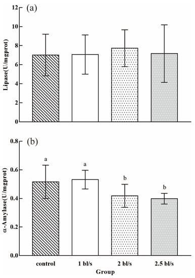 Effect of water flow velocity on the activity of intestinal digestive enzymes in fish (Plectropomus leopardus), (n = 6). (a) Lipase activity; (b) α-amylase activity. Different letters indicate significant differences among groups (p < 0.05). No letter means no significant difference among groups (p > 0.05).