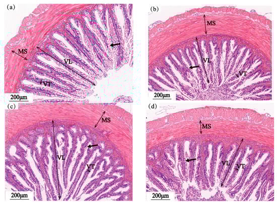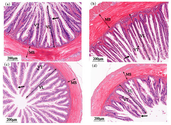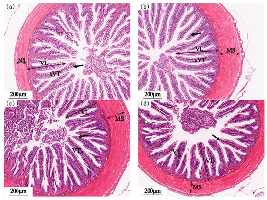 The effect of water flow velocity on the foregut structure of coral trout. (a) Hydrostatic control group: intestinal tissue was normal, muscular thickness (MS), villus length (VL), and villus thickness (VT) were uniform, and there were many goblet cells (thick arrows); (b) 1 bl/s water flow velocity group: muscular thickness (MS), villus length (VL), and villus thickness (VT) showed no significant changes compared with the control group, while goblet cells (thick arrows) were smaller and their number was relatively reduced; (c) 2 bl/s water flow velocity group: the muscle layer was thinner than in the control, while the number of goblet cells (thick arrows) was relatively reduced and their size was smaller; (d) 2.5 bl/s water flow velocity group: the muscle layer was relatively thin, while the number of goblet cells (thick arrows) in the contrast photograph was relatively small, and the morphological distribution was uneven.